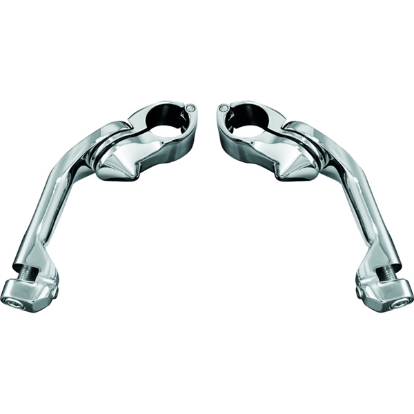 These cruise mounts with positive locking quick clamps offer an incredible range of adjustability. The entire assembly may be moved up or down on the engine guard. The arm and footpeg may be further adjusted along a vertical or horizontal arc. A unique clevis permits angle adjustment of the footpeg. The heavy-duty quick clamp and sturdy offset arm ensures that the footpegs will clear fairing lowers and will stay where you put them.